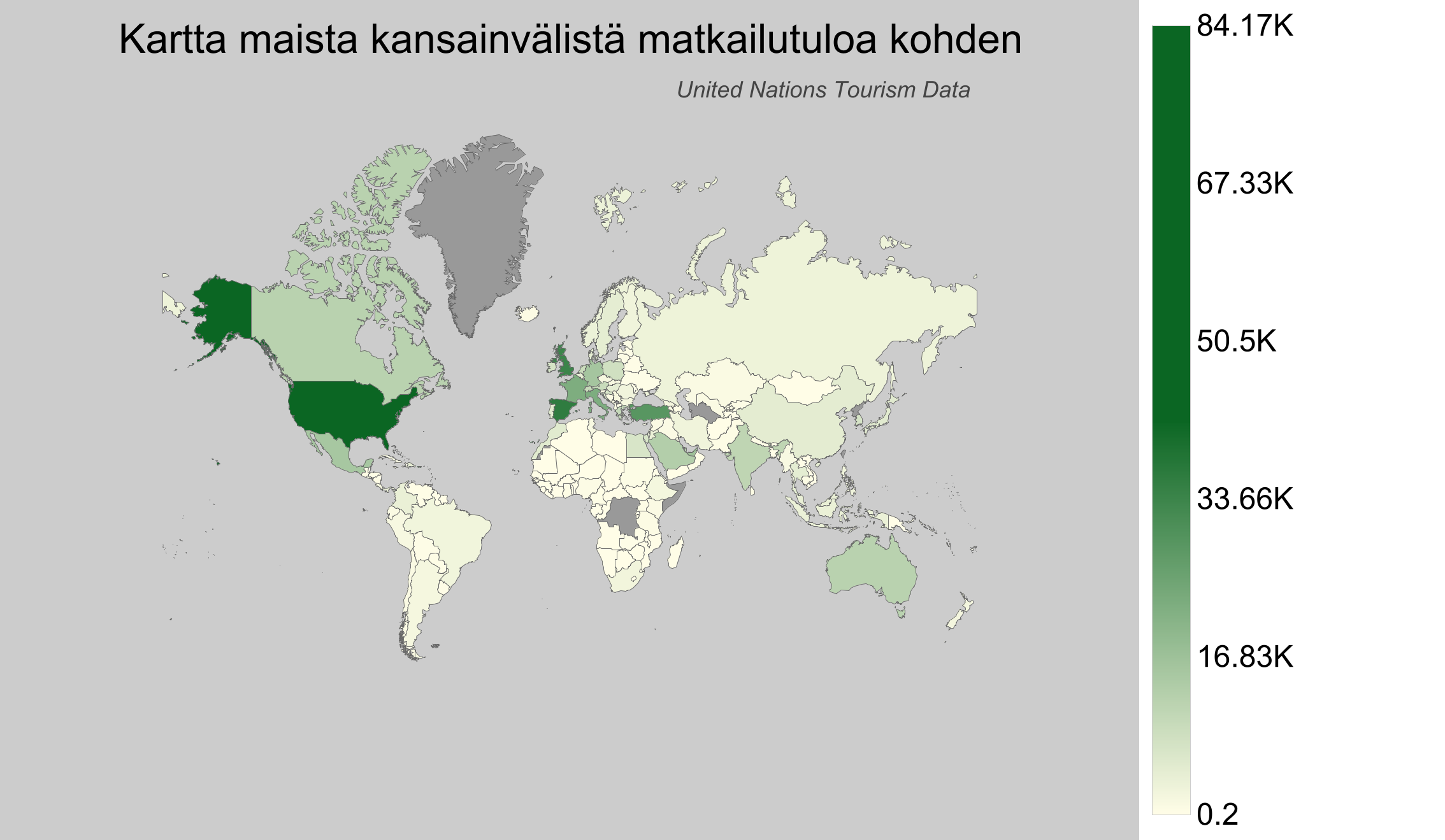 - Suomi: Vaikka Suomi ei kuulu globaalien matkailutulojen huippumaihin, maa tuottaa noin 5 miljardia dollaria matkailutuloja kansainvälisiltä matkailijoilta. Suomen ainutlaatuisuus tulee esiin sen luonnonkauniissa maisemissa, revontulissa ja kulttuuripanoksessa, vaikka sen globaali sijoitus YK:n tilastoissa on 44.