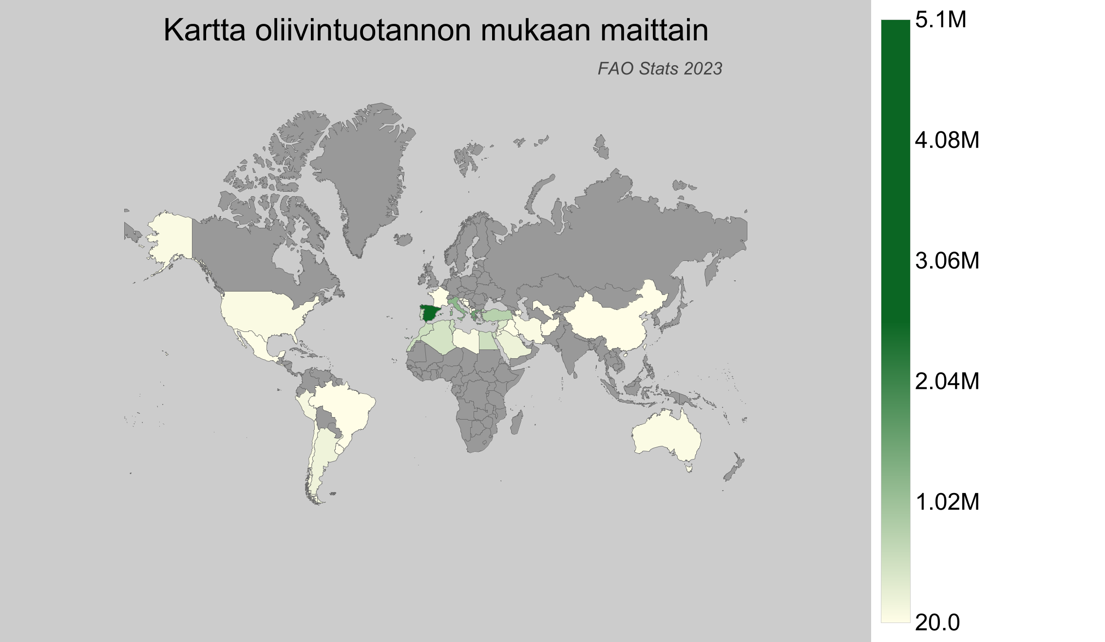 - Suomi: FAO:n tilastojen mukaan Suomi ei tuota oliiveja.